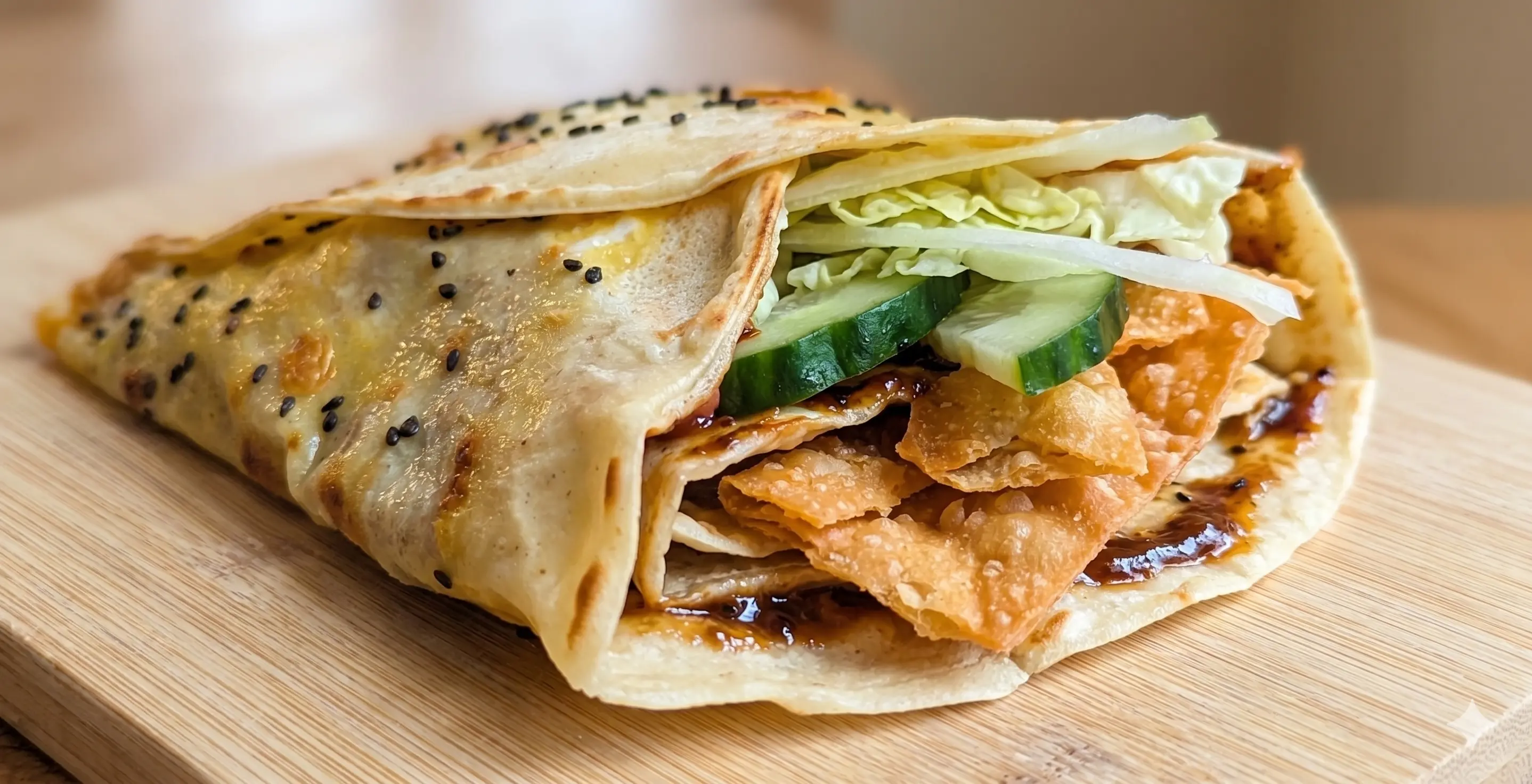 Een authentiek Chinees ontbijtgerecht: een dunne, hartige crêpe gevuld met ei, saus, verse groenten en knapperige gefrituurde wontons. Een echte streetfood topper!